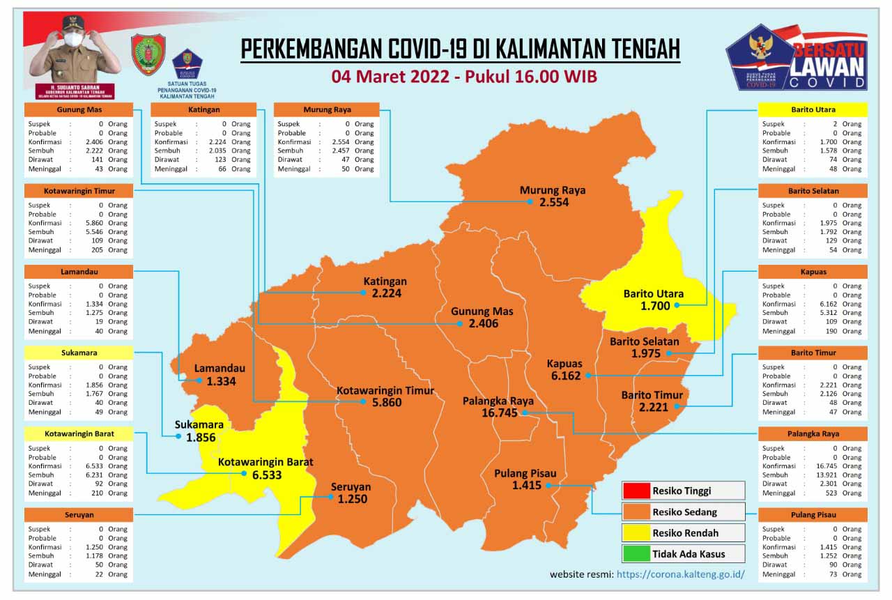 MMCKalteng - Palangka Raya - Satuan Tugas Percepatan Penanganan Covid-19 Provinsi Kalimantan Tengah (Prov. Kalteng) mengeluarkan data perkembangan terbaru kasus Covid-19 di Kalteng, Jumat (4/3/2022) Pukul 16.00 WIB. Berdasarkan data yang rilis oleh Media Center Satuan Tugas Percepatan Penanganan Covid-19 Kalteng, jumlah akumulasi data sampai dengan saat ini, pasien konfirmasi positif Covid-19 di Kalteng bertambah sebanyak 184 orang dengan total kasus mencapai 54235 orang pasien dinyatakan sembuh sebanyak 210 orang dan pasien dinyatakan meninggal dunia sebanyak 2 orang atau dengan tingkat kematian Case Fatality Rate (CFR) 3,4 persen.