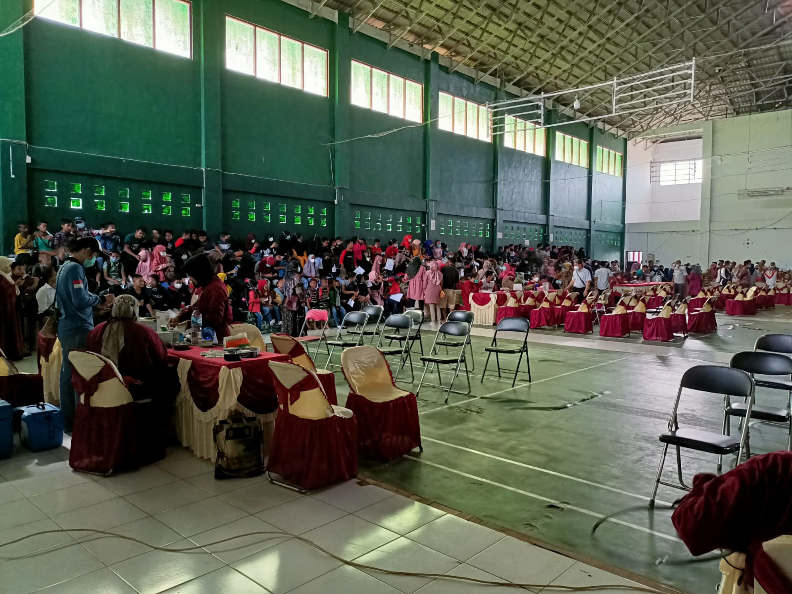 MMCKalteng – Seruyan – Pemerintah Provinsi Kalimantan Tengah (Pemprov. Kalteng) melalui Dinas Kesehatan bekerjasama dengan Dinas Kesehatan Kabupaten Seruyan menggelar vaksinasi di Gor Bulu Tangkis Kecamatan Hanau, Kabupaten Seruyan, Minggu (20/3/2022).