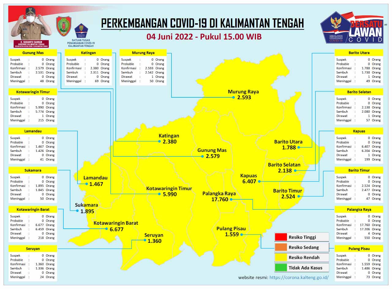 MMCKalteng - Palangka Raya - Satuan Tugas Percepatan Penanganan Covid-19 Provinsi Kalimantan Tengah (Prov. Kalteng) mengeluarkan data perkembangan terbaru kasus Covid-19 di Kalteng, Sabtu (4/6/2022) Pukul 16.00 WIB. Berdasarkan data yang rilis oleh Media Center Satuan Tugas Percepatan Penanganan Covid-19 Kalteng, jumlah akumulasi data sampai dengan saat ini, pasien konfirmasi positif Covid-19 di Kalteng bertambah sebanyak 2 orang dengan total kasus mencapai 57117 orang pasien dinyatakan sembuh sebanyak 2 orang dan pasien dinyatakan meninggal dunia sebanyak 0 orang atau dengan tingkat kematian Case Fatality Rate (CFR) 3,4 persen.