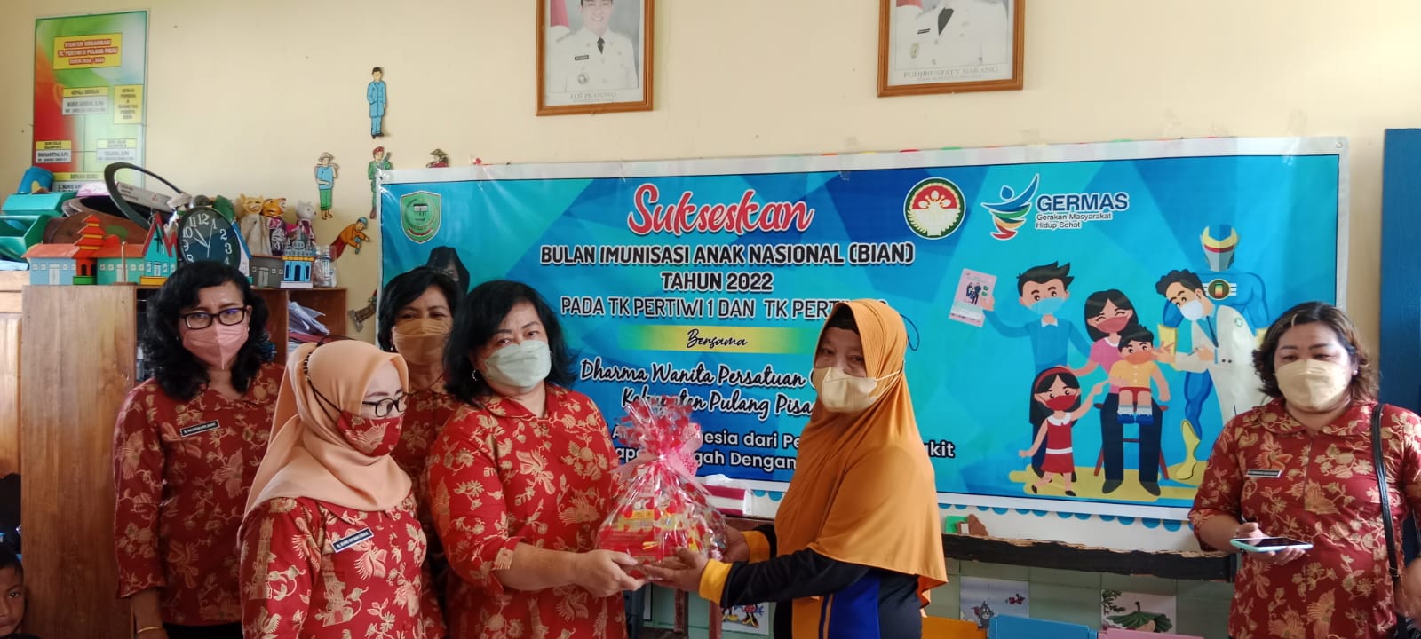 MMCKalteng - Pulang Pisau - Dharma Wanita Persatuan (DWP) Kabupaten Pulang Pisau salurkan bantuan ke TK Pertiwi I dan TK Pertiwi II dalam rangka memperingati Bulan Imunisasi Anak Nasional (BIAN) Tahun 2022, Jumat (3/6/2022) lalu. Adapun bantuan yang disalurkan dalam Program BIAN di 2 TK itu berupa alat-alat penunjang pembelajaran, baik untuk pengajar maupun pelajar.