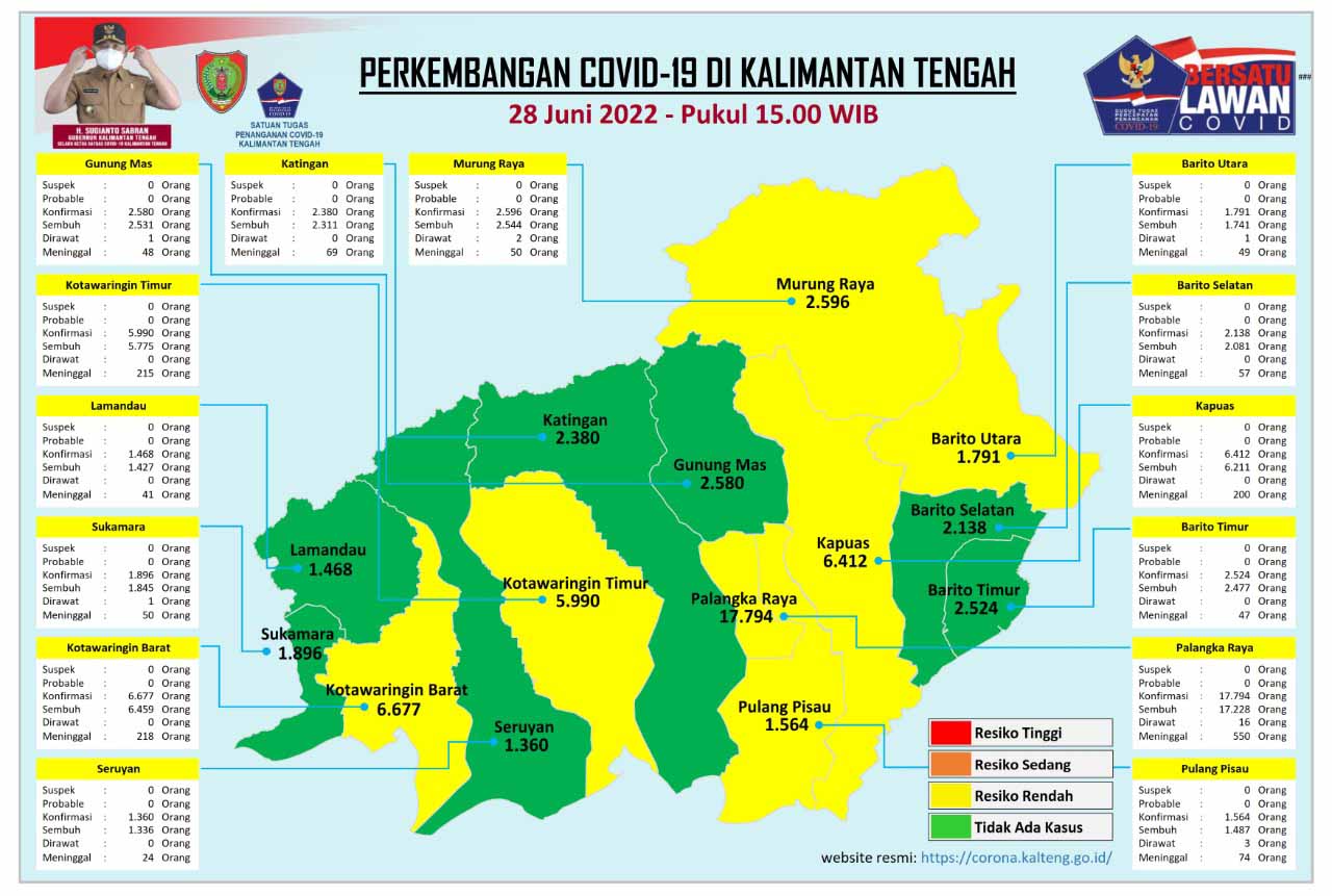 MMCKalteng - Palangka Raya - Satuan Tugas Percepatan Penanganan Covid-19 Provinsi Kalimantan Tengah (Prov. Kalteng) mengeluarkan data perkembangan terbaru kasus Covid-19 di Kalteng, Selasa (28/6/2022) Pukul 16.00 WIB. Berdasarkan data yang rilis oleh Media Center Satuan Tugas Percepatan Penanganan Covid-19 Kalteng, jumlah akumulasi data sampai dengan saat ini, pasien konfirmasi positif Covid-19 di Kalteng bertambah sebanyak 5 orang dengan total kasus mencapai 57170 orang pasien dinyatakan sembuh sebanyak 8 orang dan pasien dinyatakan meninggal dunia sebanyak 0 orang atau dengan tingkat kematian Case Fatality Rate (CFR) 3,4 persen.
