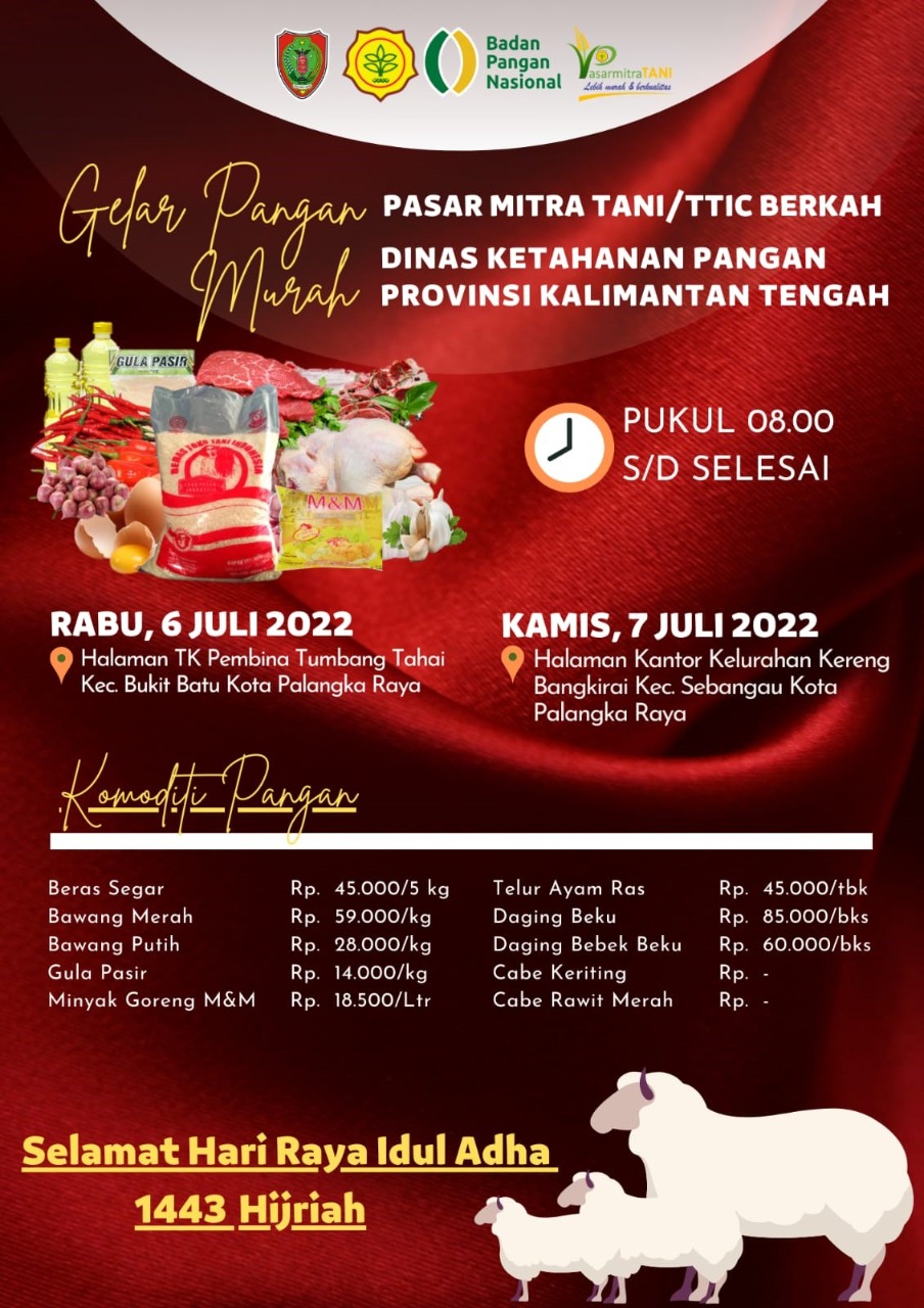 Gelar pangan murah merupakan kegiatan rutin Pasar Mitra Tani/TTIC Berkah menjelang Hari Besar Keagamaan Nasional (HBKN). Selain itu pelaksanaan gelar pangan murah ini bertujuan untuk memberi akses pangan murah dan berkualitas kepada masyarakat serta menjamin ketersediaan stok dan pasokan bahan pangan pokok.(AS&WDY/Sumber:Dinas Ketahanan Pangan Prov. Kalteng)
