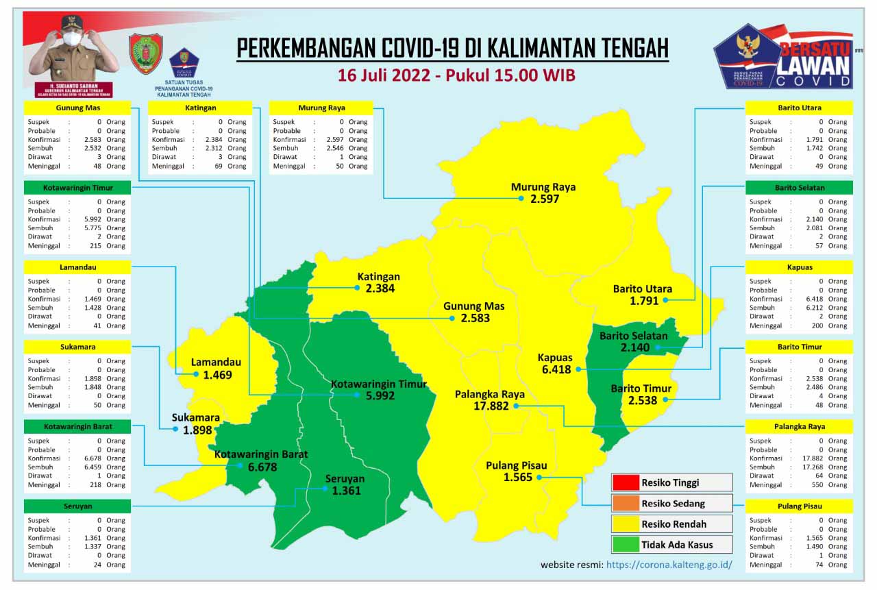 MMCKalteng - Palangka Raya - Satuan Tugas Percepatan Penanganan Covid-19 Provinsi Kalimantan Tengah (Prov. Kalteng) mengeluarkan data perkembangan terbaru kasus Covid-19 di Kalteng, Sabtu (16/7/2022) Pukul 16.00 WIB. Berdasarkan data yang rilis oleh Media Center Satuan Tugas Percepatan Penanganan Covid-19 Kalteng, jumlah akumulasi data sampai dengan saat ini, pasien konfirmasi positif Covid-19 di Kalteng bertambah sebanyak 23 orang dengan total kasus mencapai 57296 orang pasien dinyatakan sembuh sebanyak 0 orang dan pasien dinyatakan meninggal dunia sebanyak 0 orang atau dengan tingkat kematian Case Fatality Rate (CFR) 3,4 persen.
