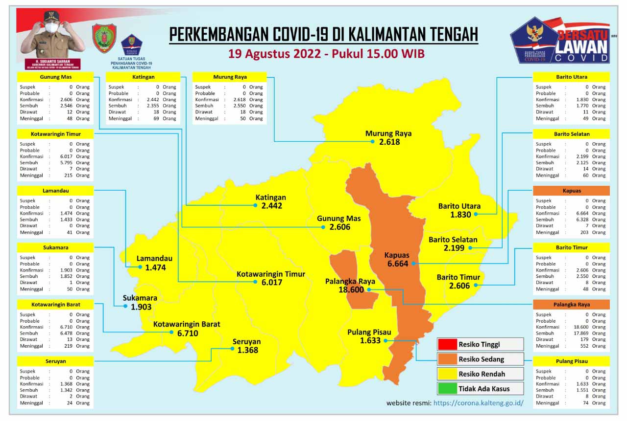 MMCKalteng - Palangka Raya - Satuan Tugas Percepatan Penanganan Covid-19 Provinsi Kalimantan Tengah (Prov. Kalteng) mengeluarkan data perkembangan terbaru kasus Covid-19 di Kalteng, Jumat (19/8/2022) Pukul 16.00 WIB. Berdasarkan data yang rilis oleh Media Center Satuan Tugas Percepatan Penanganan Covid-19 Kalteng, jumlah akumulasi data sampai dengan saat ini, pasien konfirmasi positif Covid-19 di Kalteng bertambah sebanyak 32 orang dengan total kasus mencapai 58670 orang pasien dinyatakan sembuh sebanyak 50 orang dan pasien dinyatakan meninggal dunia sebanyak 0 orang atau dengan tingkat kematian Case Fatality Rate (CFR) 3,4 persen.
