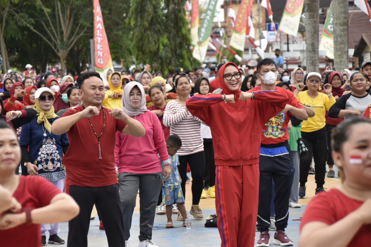 MMCKalteng – Buntok – Demi menjaga kebugaran dan stamina tubuh, Gubernur Kalteng H. Sugianto Sabran dan Ketua TP-PKK Prov. Kalteng Ivo Sugianto Sabran mengikuti senam bersama di Halaman Taman Iring Witu Buntok Kabupaten Barito Selatan, Minggu (4/9/2022).