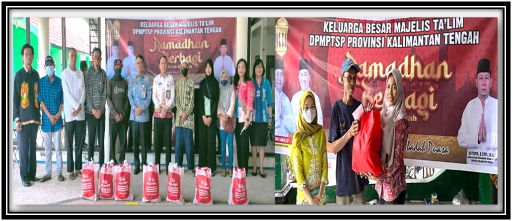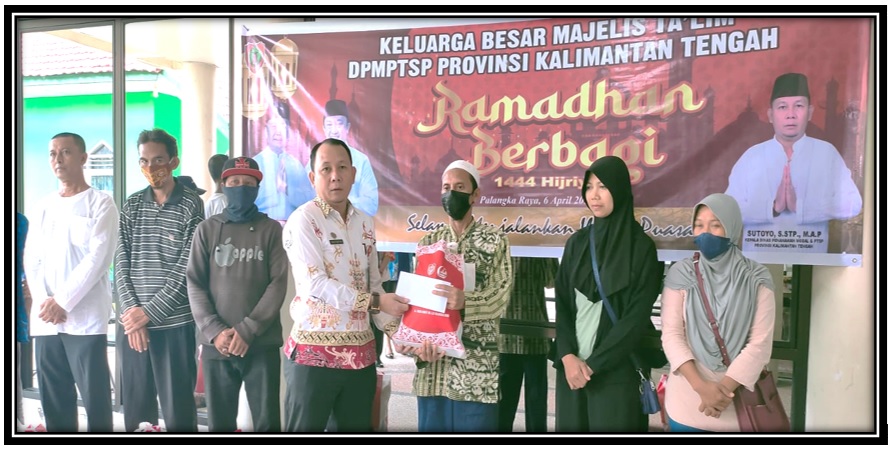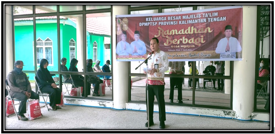 Kepala DPMPTSP Prov. Kalteng Sutoyo dalam sambutannya menyampaikan bahwa kegiatan Ramadan Berbagi ini secara rutin dilaksanakan setiap tahunnya. Adapun untuk tahun ini Majelis Taklim DPMPTSP Prov. Kalteng kembali membagikan sebanyak 30 paket sembako berupa beras, minyak goreng, gula dan beberapa kebutuhan pokok lainnya serta uang tunai ditambah lagi sumbangan pribadi langsung dari Kepala DPMPTSP Prov. Kalteng.