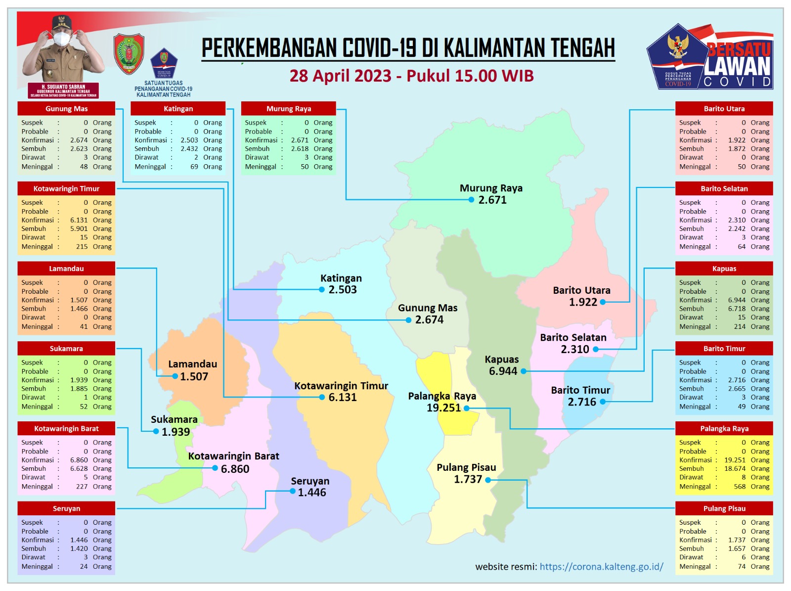 MMCKalteng - Palangka Raya - Satuan Tugas Percepatan Penanganan Covid-19 Provinsi Kalimantan Tengah (Prov. Kalteng) mengeluarkan data perkembangan terbaru kasus Covid-19 di Kalteng, Jumat (28/4/2023) Pukul 15.00 WIB. Berdasarkan data yang rilis oleh Media Center Satuan Tugas Percepatan Penanganan Covid-19 Kalteng, jumlah akumulasi data sampai dengan saat ini, pasien konfirmasi positif Covid-19 di Kalteng bertambah sebanyak 10 orang dengan total kasus mencapai 60610 orang pasien dinyatakan sembuh sebanyak 20 orang dan pasien dinyatakan meninggal dunia sebanyak 1 orang. atau dengan tingkat kematian Case Fatality Rate (CFR) 2,88 persen.