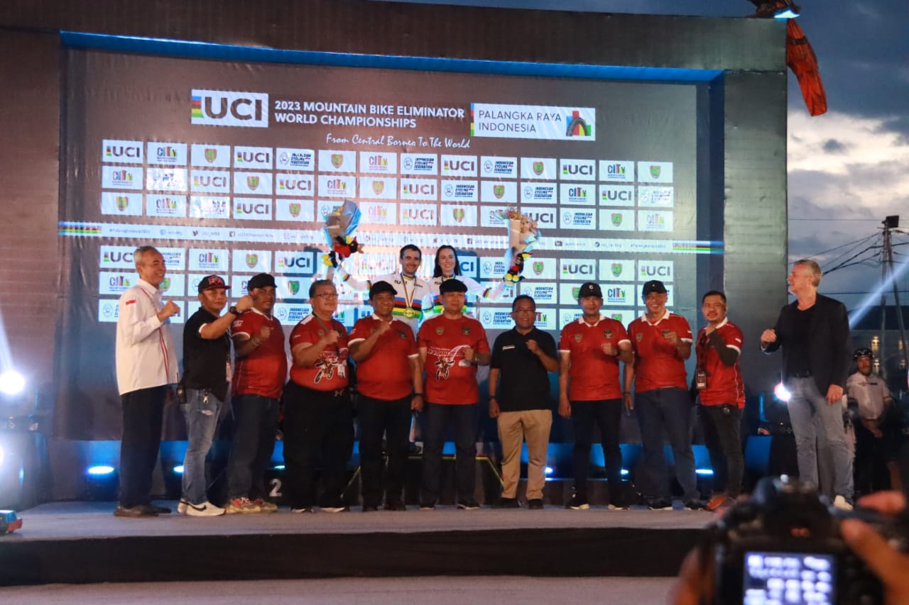 MMCKalteng - Palangka Raya - Wakil Gubernur Kalimantan Tengah (Kalteng) H. Edy Pratowo melakukan pengalungan medali dan penyerahan bunga kepada para pemenang balapan UCI MTB Eliminator World Championship 2023. Penyerahan berlangsung di Stadion Tuah Pahoe Palangka Raya, Minggu (12/11/2023).