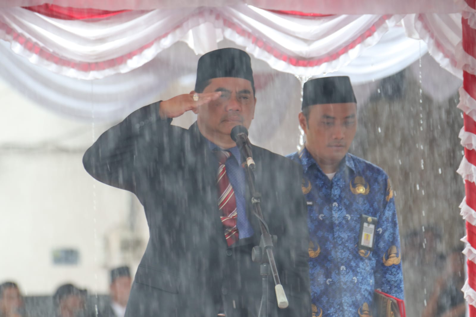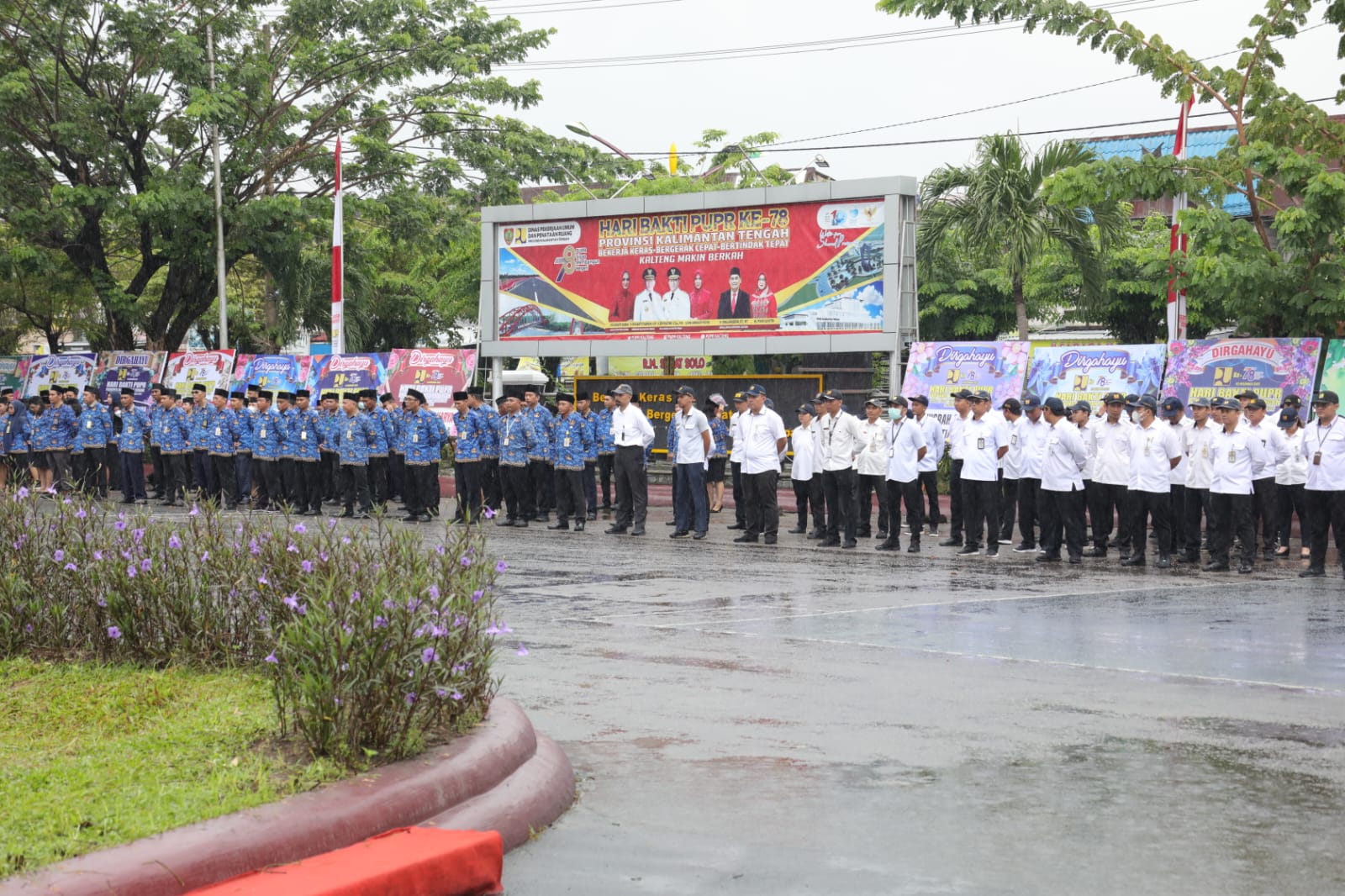 Upacara Peringatan Hari Bakti Pekerjaan Umum ke-78 tingkat Prov. Kalteng yang dipimpin langsung Kepala Dinas PUPR Prov. Kalteng H. Shalahuddin tetap berlangsung khidmat, meskipun diguyur hujan deras.