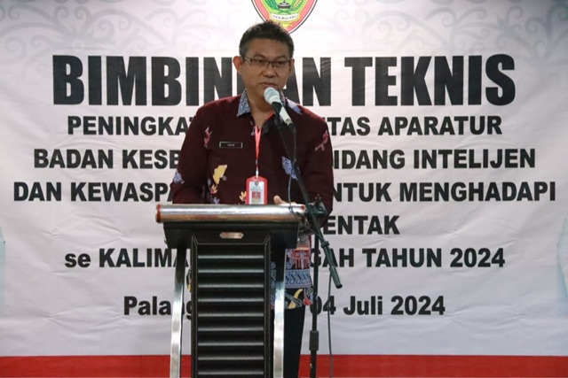 MMCKalteng – Palangka Raya - Plh. Staf Ahli (Sahli) Gubernur Bidang Pemerintahan, Hukum dan Politik Akhmad Husain mewakili Sekretaris Daerah Prov. Kalteng membuka secara resmi bimbingan teknis Deteksi Dini dan Cegah Dini dalam rangka Peningkatan Kapasitas Aparatur Bakesbangpol di Bidang Intelijen dan Kewaspadaan Dini untuk menghadapi Pilkada Serentak Tahun 2024 Se-Kalteng, bertempat di Meeting Room Hotel Neo Palma, Palangka Raya, Kamis (4/7/2024).