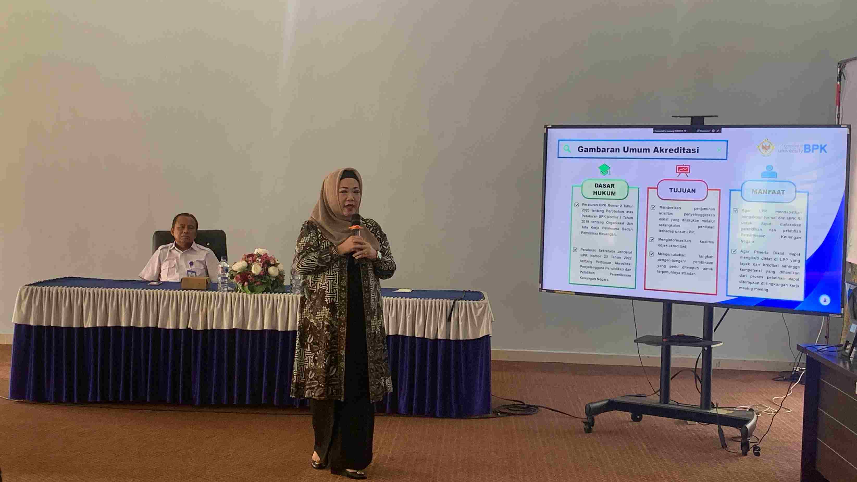 Dalam sambutannya, Kepala Bidang Sertifikasi Kompetensi mengatakan bahwa sosialisasi ini bertujuan untuk memberikan pemahaman yang lebih baik kepada para peserta tentang pentingnya akreditasi dalam penyelenggaraan pendidikan dan pelatihan pemeriksaan keuangan negara.