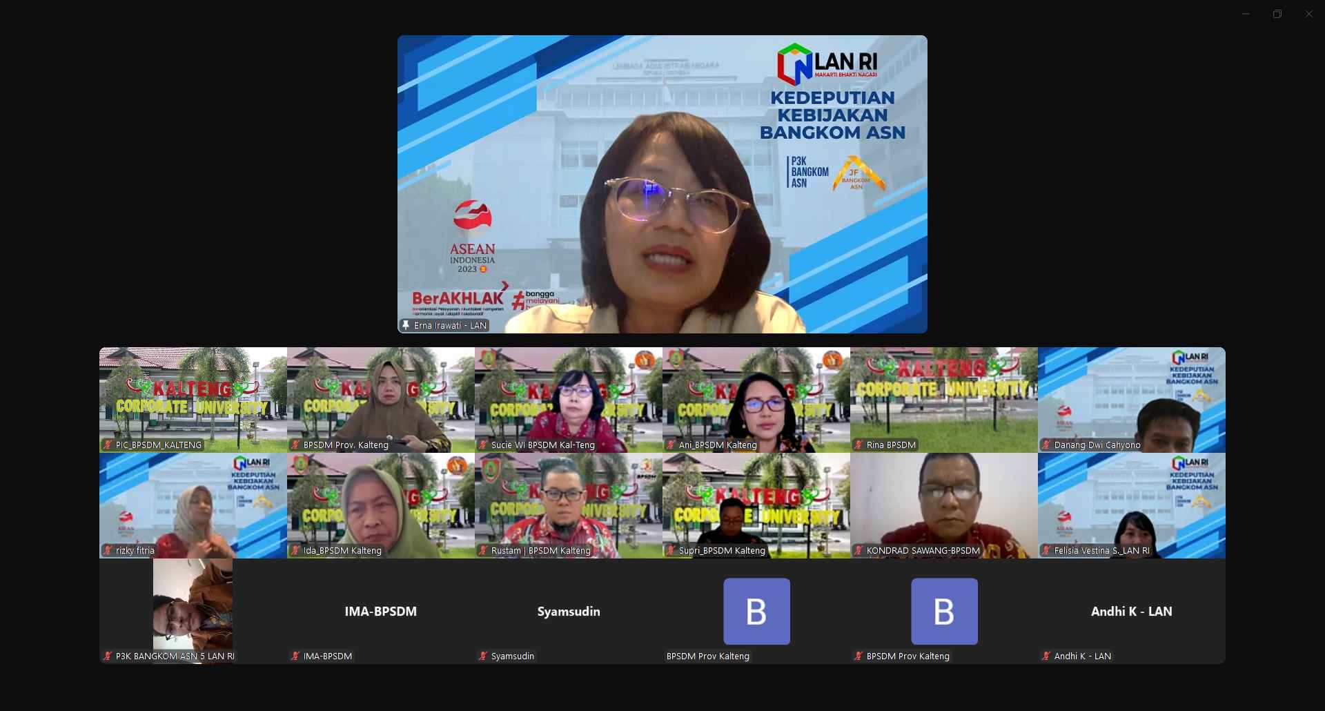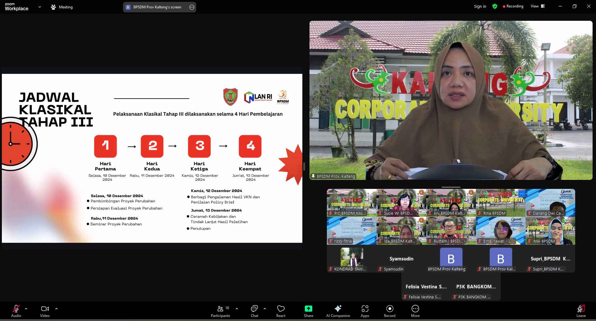 MMCKalteng - Palangka Raya - Badan Pengembangan Sumber Daya Manusia (BPSDM) Provinsi Kalimantan Tengah bersama Lembaga Administrasi Negara Republik Indonesia (LAN RI) menggelar Rapat Koordinasi secara daring melalui zoom meeting, Kamis (28/11/2024). Rapat ini diikuti oleh perwakilan Deputi Bidang Kebijakan Bangkom ASN LAN RI Erna Irawati, tim pelaksana dari BPSDM Kalimantan Tengah, fasilitator, dan panitia teknis. Diskusi berfokus pada pengaturan jadwal kegiatan, penjaminan kualitas pelaksanaan, dan kesiapan sarana pendukung untuk memastikan seluruh agenda berjalan lancar.