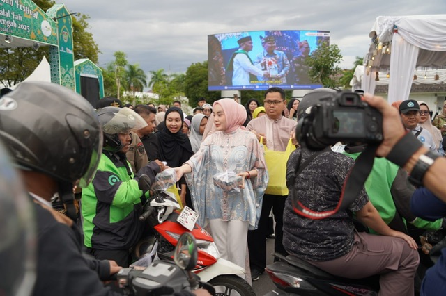 MMCKalteng - Palangka Raya - Ketua Tim Penggerak Pemberdayaan dan Kesejahteraan Keluarga (TP-PKK) Provinsi Kalimantan Tengah (Prov. Kalteng) Aisyah Thisia Agustiar Sabran berbagi 1.000 takjil kepada masyarakat yang mengunjungi Bundaran Besar di Palangka Raya, Minggu (09/03/2025). Kegiatan tersebut dilakukan dalam rangka menyambut bulan suci Ramadan dan sebagai bentuk kepedulian terhadap sesama.