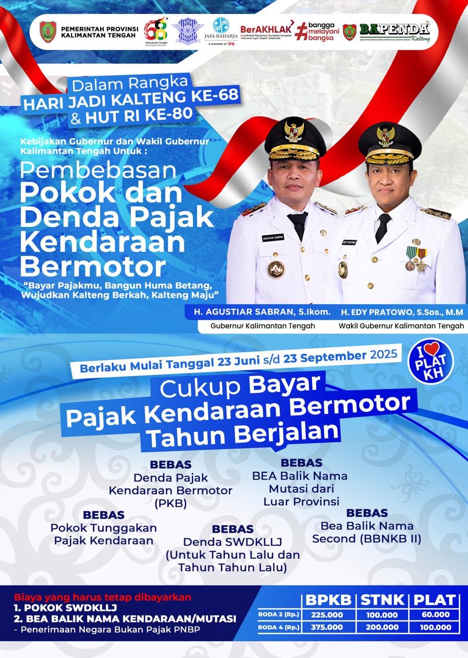 Sejalan dengan misi Gubernur dan Wakil Gubernur Kalimantan Tengah untuk meningkatkan kesejahteraan ekonomi melalui optimalisasi Pendapatan Asli Daerah (PAD), Bapenda Prov. Kalteng bekerja sama dengan PT. Jasa Raharja dan Dirlantas Provinsi Kalimantan Tengah melakukan sosialisasi kebijakan Gubernur Kalimantan Tengah dalam rangka HUT RI tahun 2025 tentang Pembebasan Pokok dan Denda Pajak Kendaraan Bermotor Plat KH.