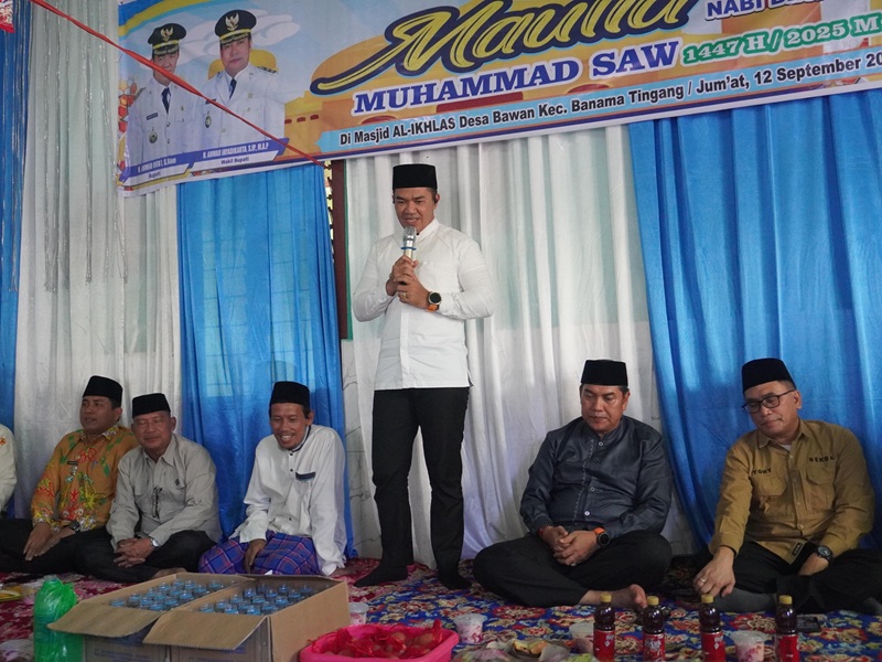 MMCKalteng - Pulang Pisau - Bupati Pulang Pisau Kalimantan Tengah, H. Ahmad Rifa’i bersama Wakil Bupati H. Ahmad Jayadikarta menghadiri Safari Peringatan Maulid Nabi Muhammad SAW 1447 H/2025 M di Masjid Al Ikhlas, Desa Bawan, Kecamatan Banama Tingang, Jumat (12/9/2025) siang.