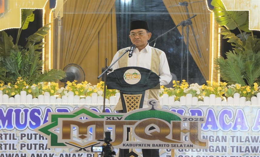 MMCKalteng - Buntok - Wakil Bupati Barito Selatan Khristianto Yudha membuka secara resmi Musabaqah Tilawatil Quran dan Hadits (MTQH) ke-45 Tingkat Kabupaten Barito Selatan (Barsel) di Arena Terbuka Masjid Agung Baiturrahman Buntok, Kamis (2/10/2025). Turut hadir Pj. Sekretaris Daerah Kabupaten Barito Selatan, Ita Minarni beserta unsur Forkopimda Kabupaten Barito Selatan, asisten sekda dan kepala perangkat daerah..
