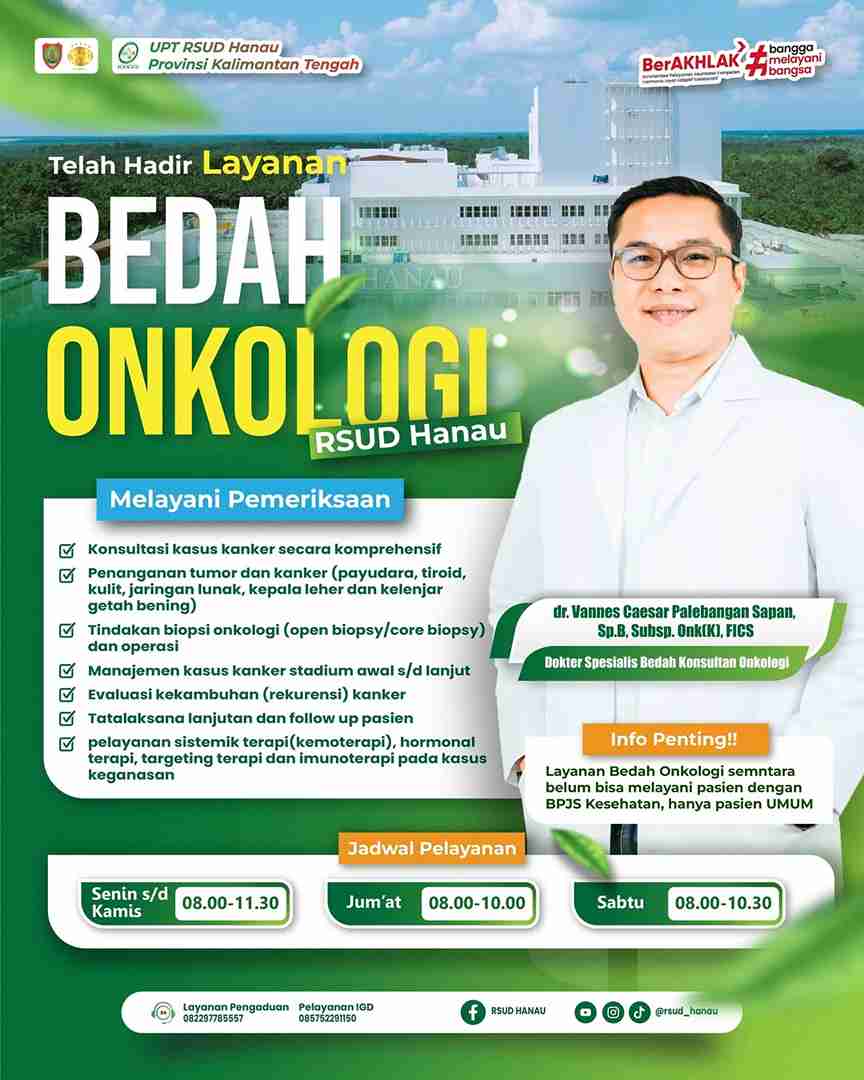 Melalui layanan ini, masyarakat di wilayah Hanau dan sekitarnya kini dapat memperoleh pelayanan bedah onkologi dengan lebih mudah dan cepat. RSUD Hanau berharap kehadiran layanan ini dapat menjadi harapan baru bagi pasien tumor dan kanker untuk mendapatkan penanganan medis yang tepat, profesional, serta meningkatkan peluang kesembuhan melalui deteksi dini dan pengobatan yang optimal.(Yanor Akhmad/Flayer: Tim Medos)/Edt:UL