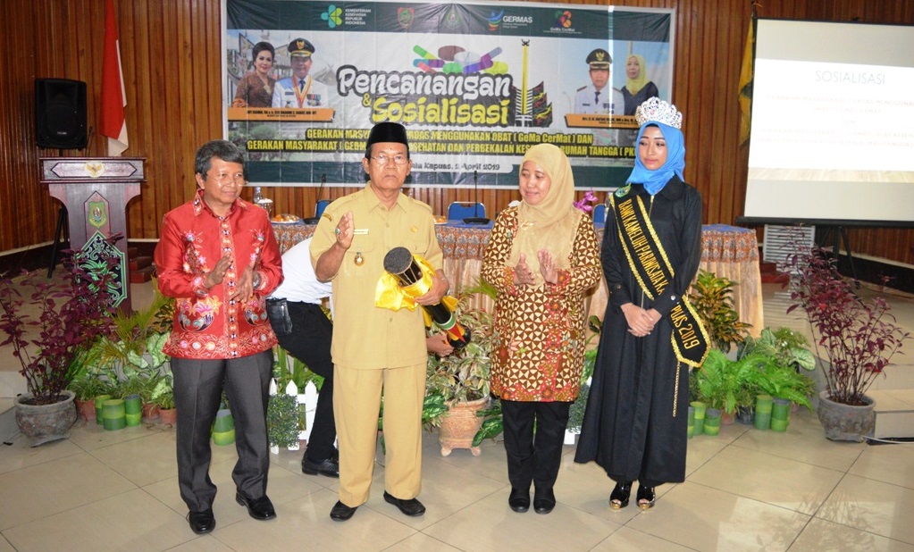 MMCKalteng - Kapuas - Pencanangan dan Sosialisasi Gerakan Masyarakat Cerdas Mengunakan Obat atau Gema Cermat dan Gerakan Masyarakat (Germas) Alat Kesehatan serta Perbekalan Kesehatan Rumah Tangga (PKRT) diikuti oleh 240 peserta yang dibuka oleh Bupati Kapuas Ben Brahim S Bahat yang dalam kesempatan itu diwakili oleh Wakil Bupati Kapuas H M Nafiah Ibnor yang ditandai dengan pemukulan katambung dan penyematan pin kepada perwakilan apoteker, Selasa (2/4/2019) pagi di Aula Kantor Bappeda Kabupaten Kapuas.