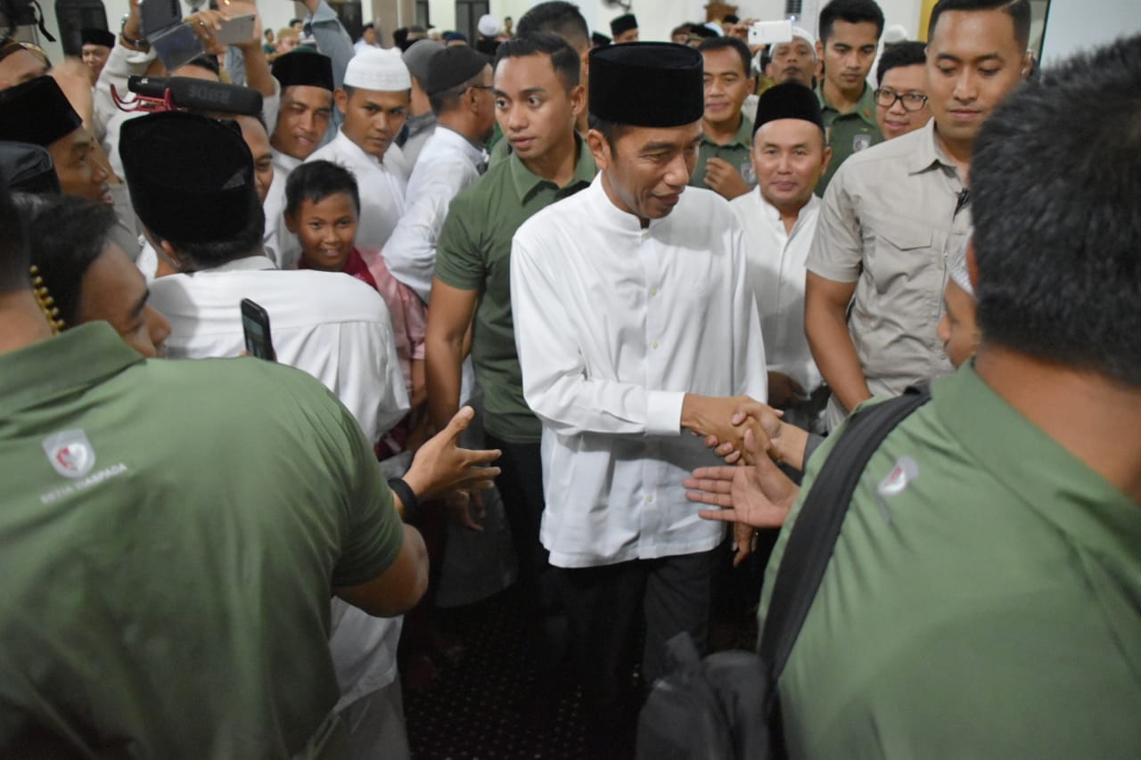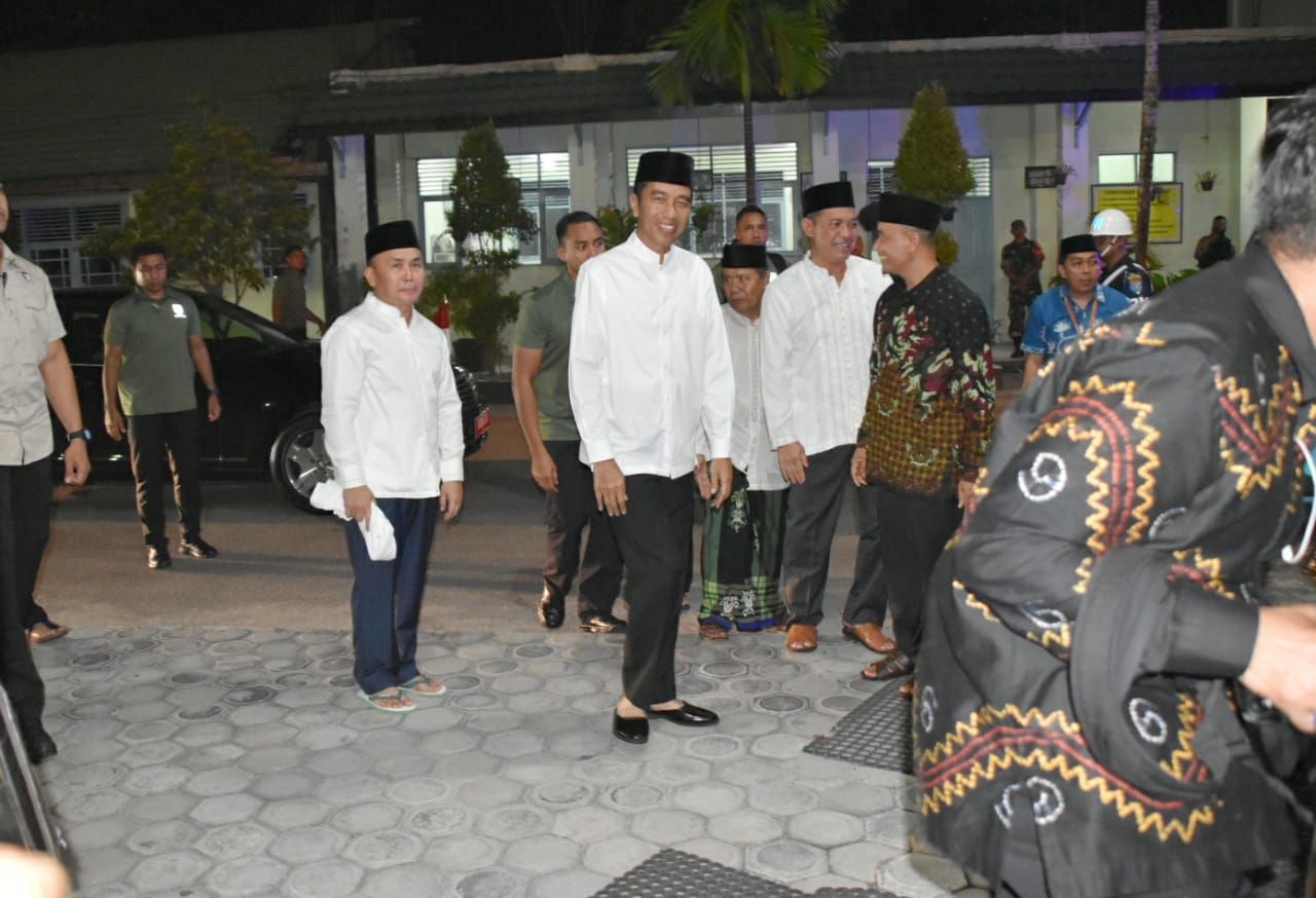 MMCKalteng - Palangka Raya - Presiden Republik Indonesia Ir. H. Joko Widodo, saat ditemui usai melakukan Ibadah Salat Tarawih, di Masjid Darul Arqam, komplek Perguruan Wilayah Muhammadiyah Provinsi Kalteng, jalan RTA. Milono Km. 1,5 Palangka Raya, Selasa (7/5) malam menyampaikan beberapa hal terkait peninjauan esok hari.