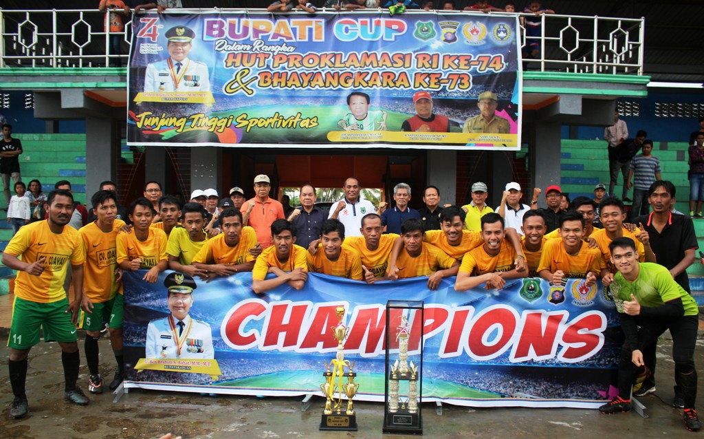 MMCKalteng – Kapuas - Bupati Kapuas Ben Brahim S Bahat secara resmi menutup kegiatan turnamen sepak bola Bupati Cup tahun 2019 sekaligus menyerahkan piala bergilir kepada pemenang turnamen dalam rangka memeriahkan Hari Ulang Tahun (HUT) Proklamasi Republik Indonesia ke 74 dan Bhayangkara ke 73, Minggu (21/7/2019) sore di Stadion Tingang Menteng Panunjung Tarung Kuala Kapuas.