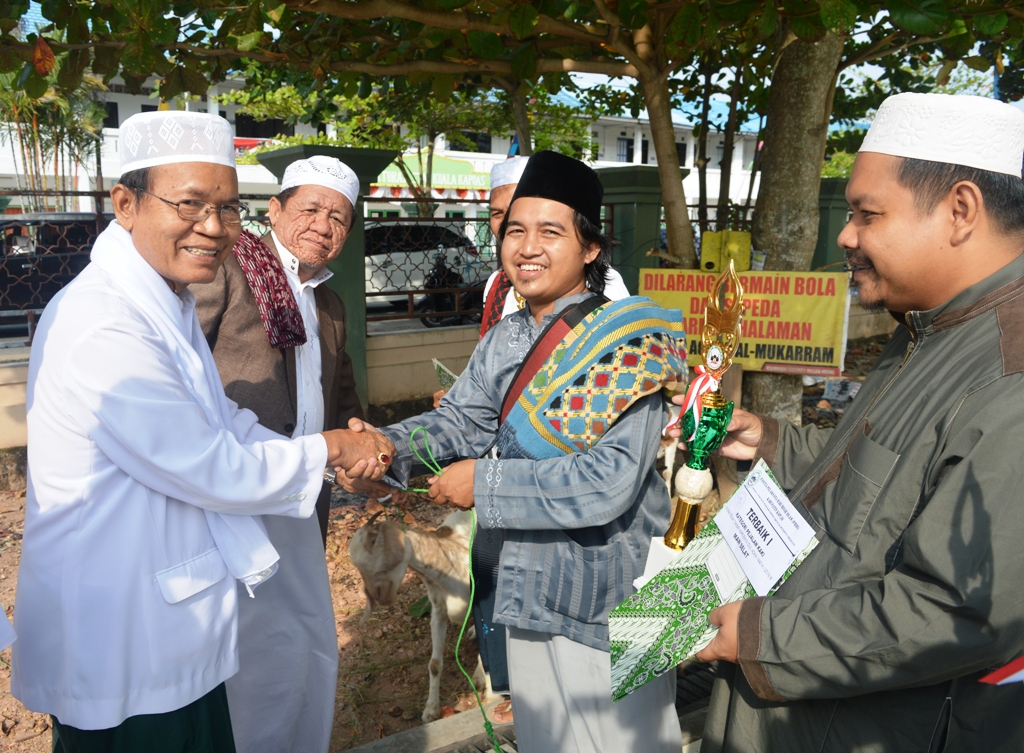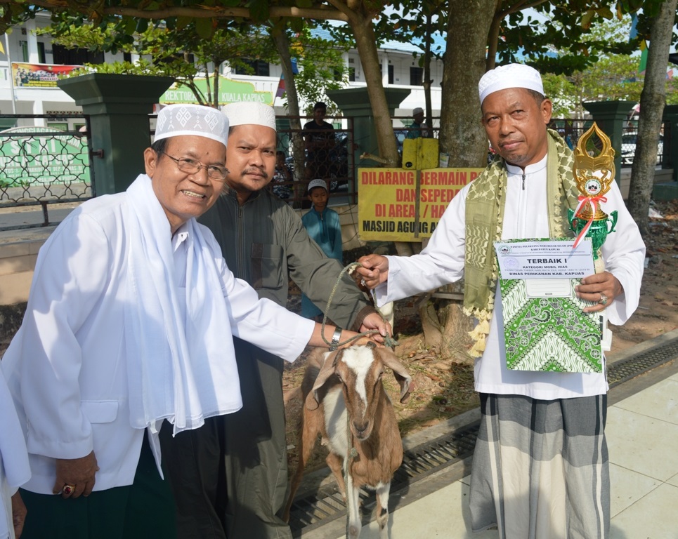 MMCKalteng - Kapus - Wakil Bupati Kapuas HM Nafiah Ibnor menyerahkan secara langsung hadiah berupa satu ekor kambing kepada pemenang juara satu disetiap kategori pada Pawai Gema Takbir Hari Raya Idul Adha 1440 H/ 2019 M. Penyerahan hadiah tersebut berlangsung di halaman Masjid Agung Al Mukarram seusai sholat Idul Adha, Minggu (11/08/2019) pagi.