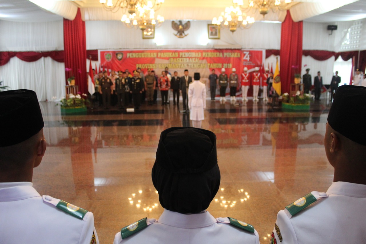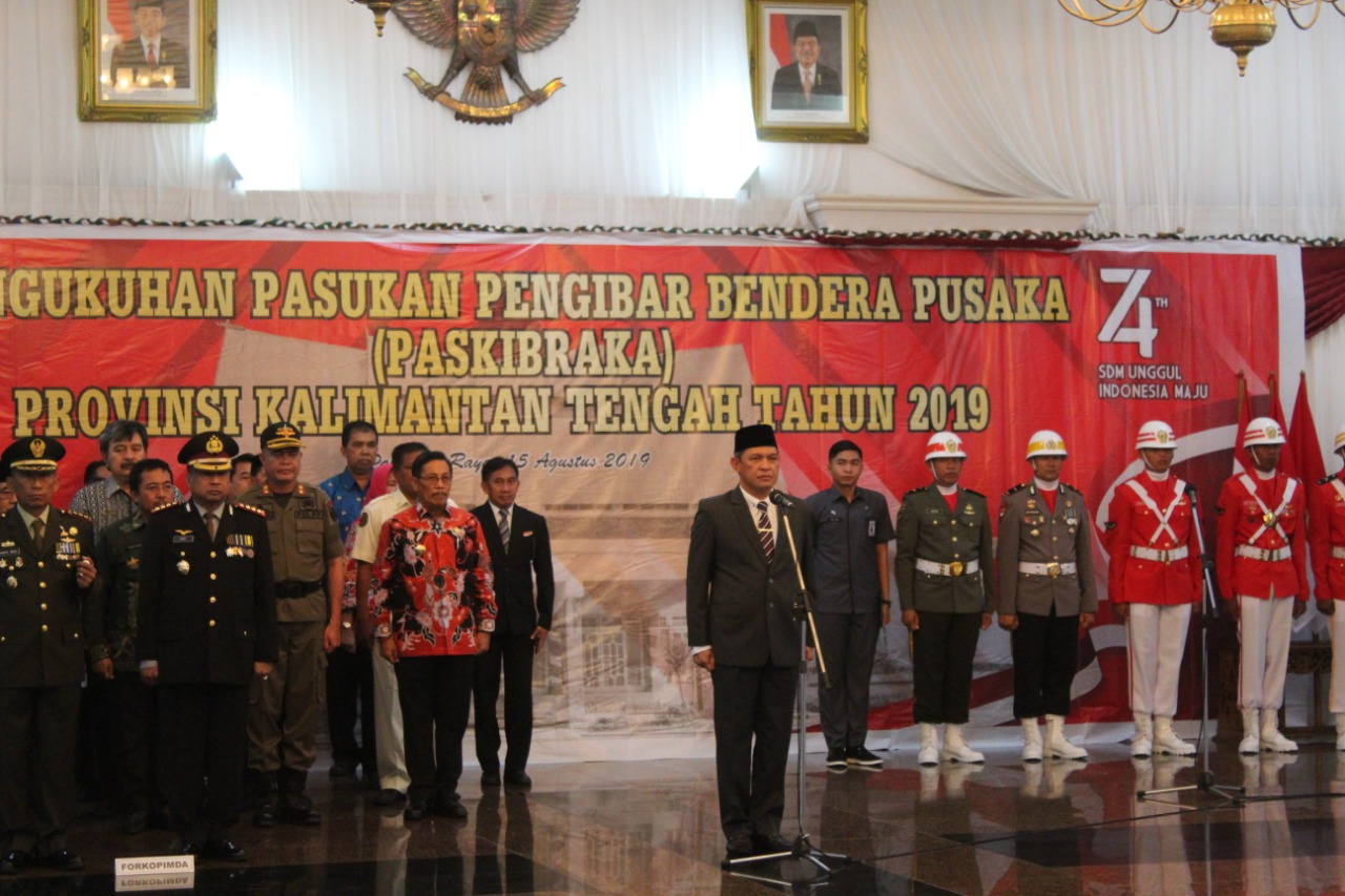 MMCKalteng - Palangka Raya - Gubernur Kalimantan Tengah (Kalteng) H. Sugianto Sabran yang diwakili oleh Sekda Prov. Kalteng Fahrizal Fitri, S.Hut., M.P mengukuhkan 73 orang Pasukan Pengibar Bendera Pusaka (Paskibraka), bertempat di Istana Isen Mulang, Jumat (16/8/2019).