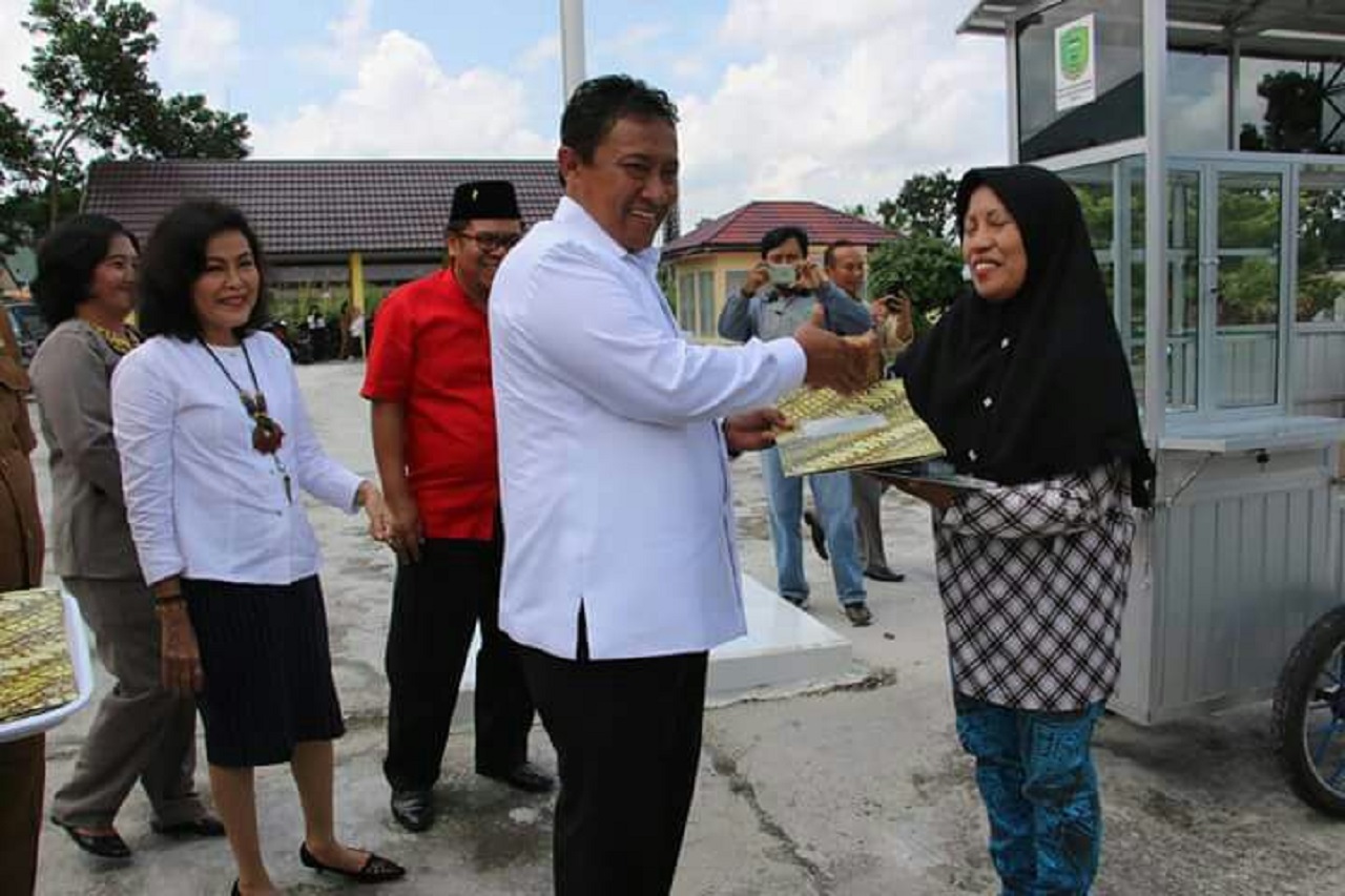 MMCKalteng - Bupati Pulang Pisau Edy Pratowo serahkan bantuan gerobak dagang sebanyak enam unit kepada para Pelaku usaha Mikro Kecil Menengah (UMKM) Khususnya Pedagang Kaki Lima (PKL) di Wilayah Kabupaten Pulang Pisau sebagai upaya pemberdayaan dan peningkatan kesejahteraan perekonomian masyarakat yang berwirausaha di Kabupaten Pulang Pisau Khususnya di Kecamatan Kahayan Hilir, Senin (12/02).