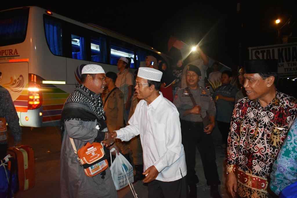 MMCKalteng - Kapuas - Jamaah Haji Kabupaten Kapuas yang tergabung dalam kloter 8 tiba di Kabupaten Kapuas dengan selamat dan dalam keadaan sehat wal afiat. Kedatangan jamaah haji tersebut disambut langsung oleh Wakil Bupati Kapuas HM Nafiah Ibnor didampingi Kepala Kemenag Ahmad Bahruni, Asisten Pemerintahan dan Kesejahteraan Rakyat Setda Kabupaten Kapuas Ilham Anwar, dan Sekretaris DPRD Kabupaten Kapuas Drs H Hidayatullah M.Ikom di Halaman Masjid Agung Al Mukarram Amanah, Senin (02/09/2019) pukul 01.00 WIB dini hari, setelah sebelumnya dijadwalkan tiba di Kapuas pada pukul 13.00 WIB, Minggu (01/09/2019).