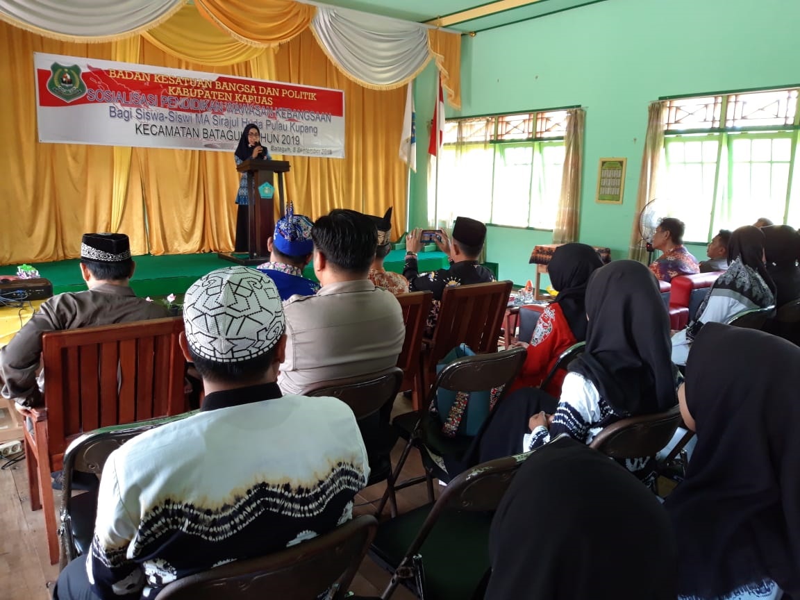 MMCKalteng - Kapuas - Pemerintah Kabupaten Kapuas dalam hal ini Badan Kesbangpol Kabupaten Kapuas rutin melakukan Sosialisasi Pendidikan Wawasan Kebangsaan bagi siswa-siswi di Kabupaten Kapuas. Pada pelaksanaan Sosialisasi Pendidikan Wawasan Kebangsaan bagi siswa-siswi Madrasah Aliyah Sirajul Huda Pulau Kupang Kecamatan Bataguh diikuti 121 siswa siswi, Kamis (5/9/19) pagi.