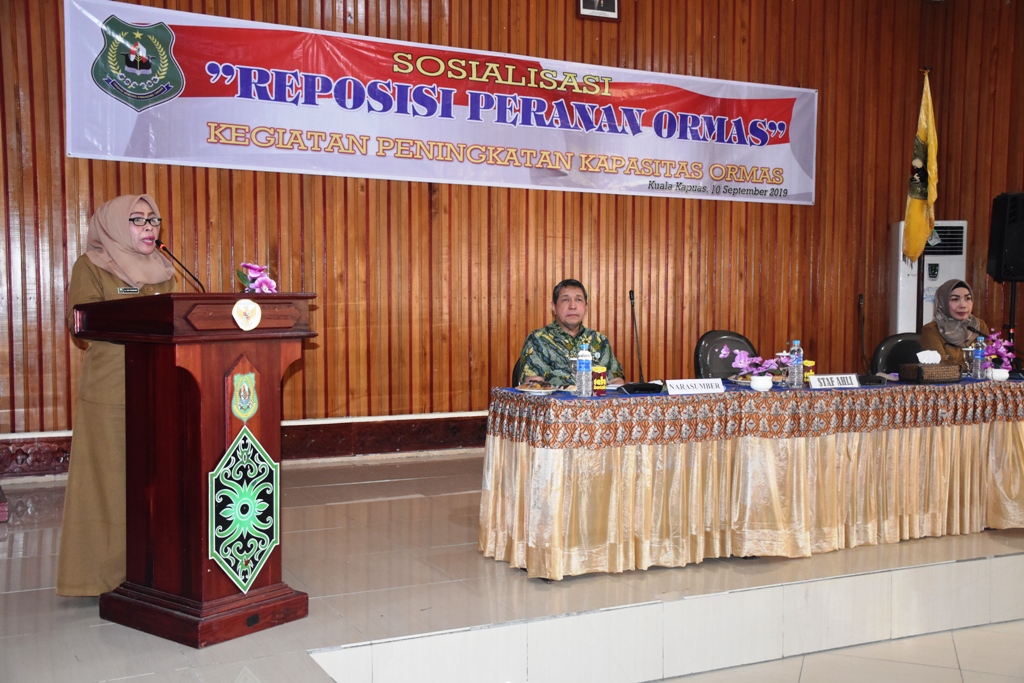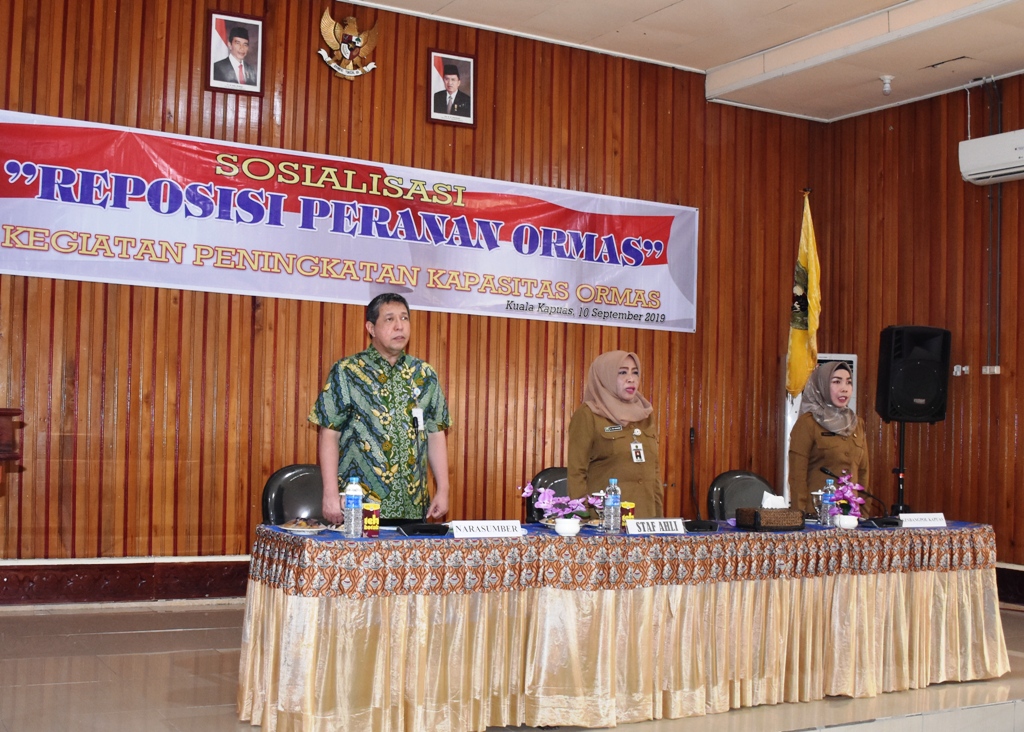MMCKalteng - Kapuas - Dalam rangka pelaksanaan kegiatan peningkatan kapastis Organisasi Masyarakat (Ormas) Pemerintah Daerah Kabupaten Kapuas dalam hal ini Badan Kesatuan Bangsa dan Politik Kabupaten Kapuas menggelar Sosialisasi Reposisi Peranan Ormas yang digelar di Aula Kantor Bappeda Kabupaten Kapuas, Selasa (10/9/2019) pagi.