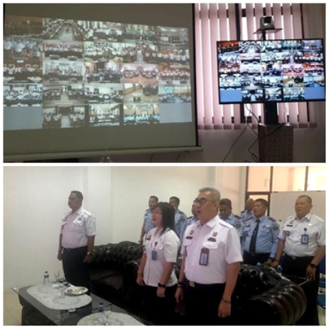 MMCKalteng - Palangka Raya - Bertempat di aula Kantor Wilayah Kementerian Hukum dan HAM Kalimantan Tengah, pagi ini, Rabu (11/09). Para pejabat struktural eselon II dan III dan Kepala UPT Pemasyarakatan dan Imigrasi se-Kota Palangka Raya mengikuti Teleconference prosesi Rapat Senat Terbuka Pengukuhan Gelar Guru Besar Kepada Menteri Hukum dan Hak Asasi Manusia R.I Prof. Yasonna H. Laoly, SH., M/Sc., Ph.D dari Sekolah Tinggi Ilmu Kepolisian Perguruan Tinggi Ilmu Kepolisian (STIK-PTIK) LEMDIKLAT POLRI.