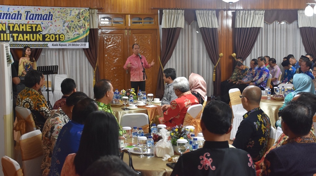 mmckalteng - KUALA KAPUAS – Bupati Kapuas Ben Brahim S Bahat sambut kehadiran para pimpinan Bank Kalteng baik dari Provinsi maupun Kabupaten Kapuas, Kamis (24/10/2019) malam, yang mana dilaksanakan kegiatan ramah tamah di Rumah Jabatan Bupati Kapuas dalam rangka kegiatan undian Taheta ke XXIII tahun 2019 di Kabupaten Kapuas. Adapun hadir dalam kegiatan tersebut Dandim 1011/Klk Letkol Kav Kristianto Bawono, kemudian pimpinan Bank Kalteng dari Provinsi Kalimantan Tengah yaitu Direktur Utama Bank Kalteng Yayah Diasmono, Dewan Komisaris dan Direksi PT Bank Kalteng, segenap pimpinan divisi dan jajaran.