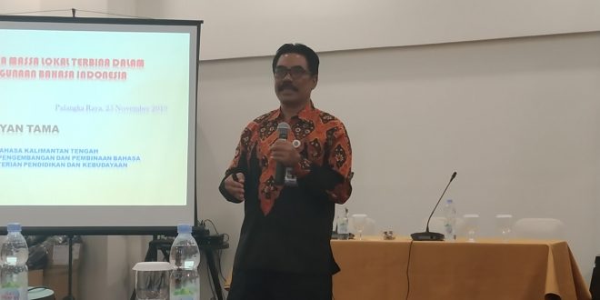 Baca juga : Tingkatkan Produksi dan Mutu Beras, Kadis TPHP Prov Kalteng Kawal Panen Padi Lokal di Kabupaten KapuasI Wayan Tama, Kepala Balai Bahasa Provinsi Kalimantan Tengah memaparkan materi media massa lokal terbina dalam penggunaan bahasa Indonesia yang diikuti oleh para penulis, penyunting dan editor dari berbagai media cetak, media massa, media elektronik, dan media online yang ada di Kalimantan Tengah.