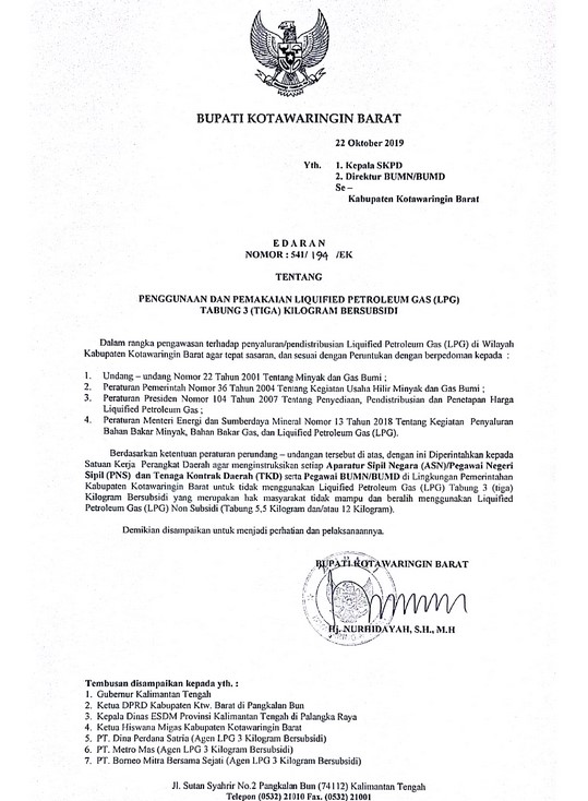 Edaran ini dibuat dalam rangka penyaluran dan pendistribusian LPG di Wilayah Kabupaten Kobar agar tepat sasaran dan sesuai peruntukan dan berpedoman pada Undang-undang Nomor 22 Tahun 2001 Tentang Minyak dan Gas Bumi, Peraturan Pemerintah Nomor 36 Tahun 2004 Kegiatan Usaha Hilir Minyak dan Gas Bumi, Peraturan Presiden Nomr 104 Tahun 2007 Tentang Penyediaan, Pendistribusian dan Penetapan Harga Liquified Petroleum Gas dan Peraturan Menteri Energi dan Sumber Daya Mineral Nomor 13 Tahun 2018 Tentang kegiatan Penyaluran Bahan Bakar Minyak, Bahan Bakar Gas dan Liquified Petroleum Gas (LPG). (humas diskominfo kobar)